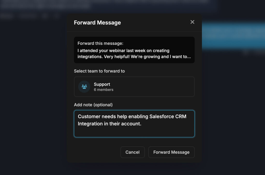 Talking to a customer in support but they mention how much they love you? Forward a single message to marketing for follow-up while you stay focused on delivering great support.